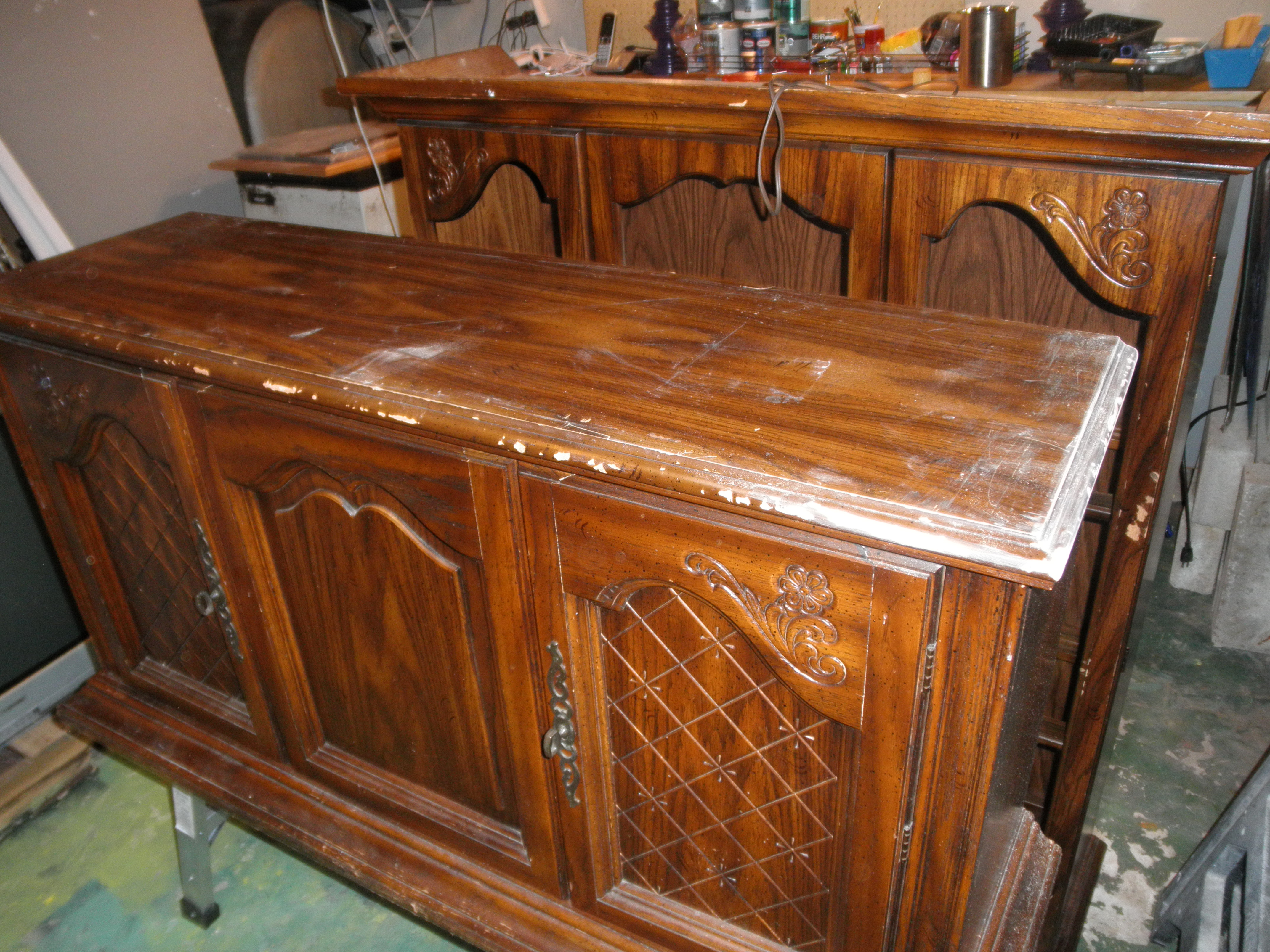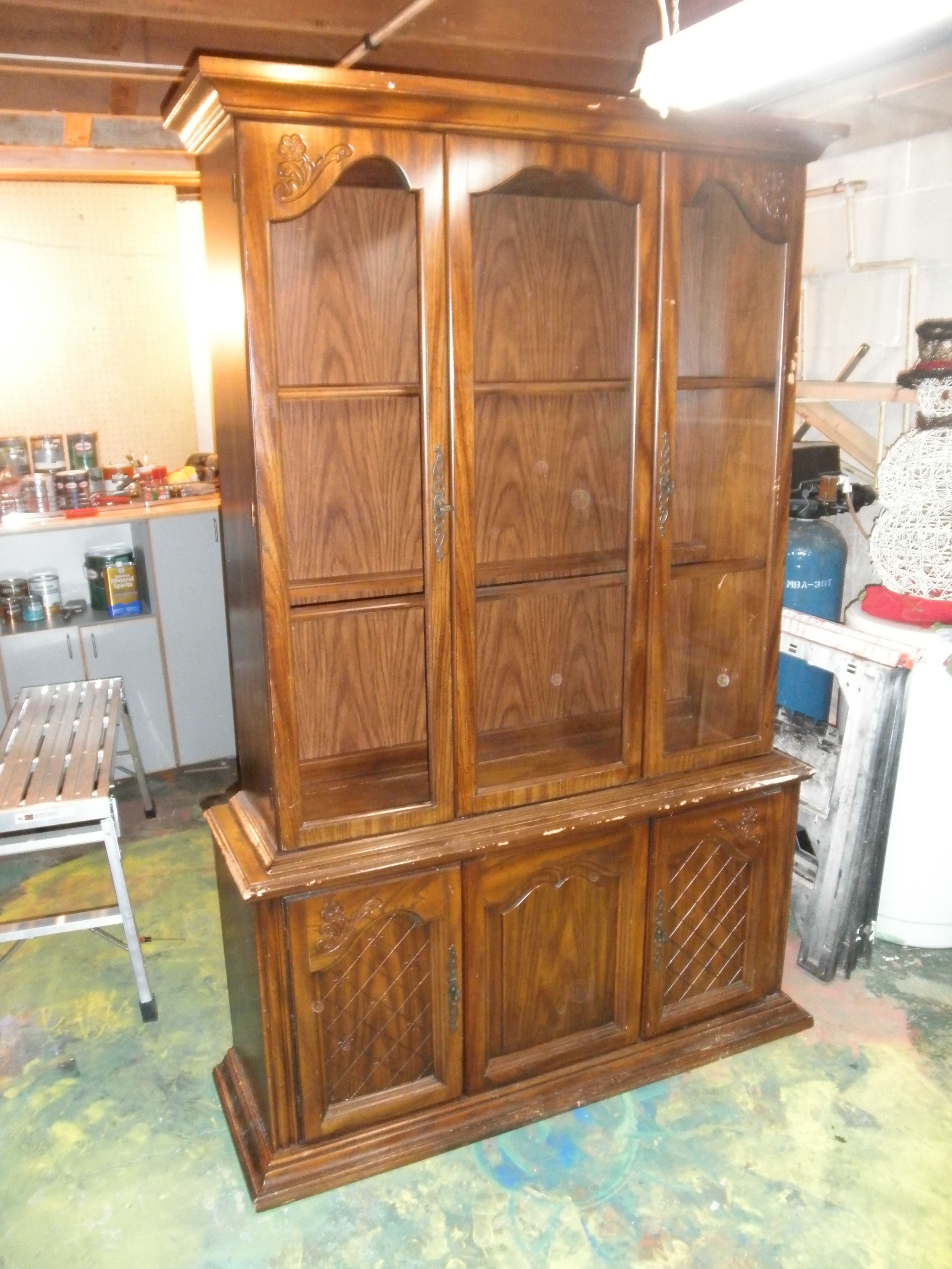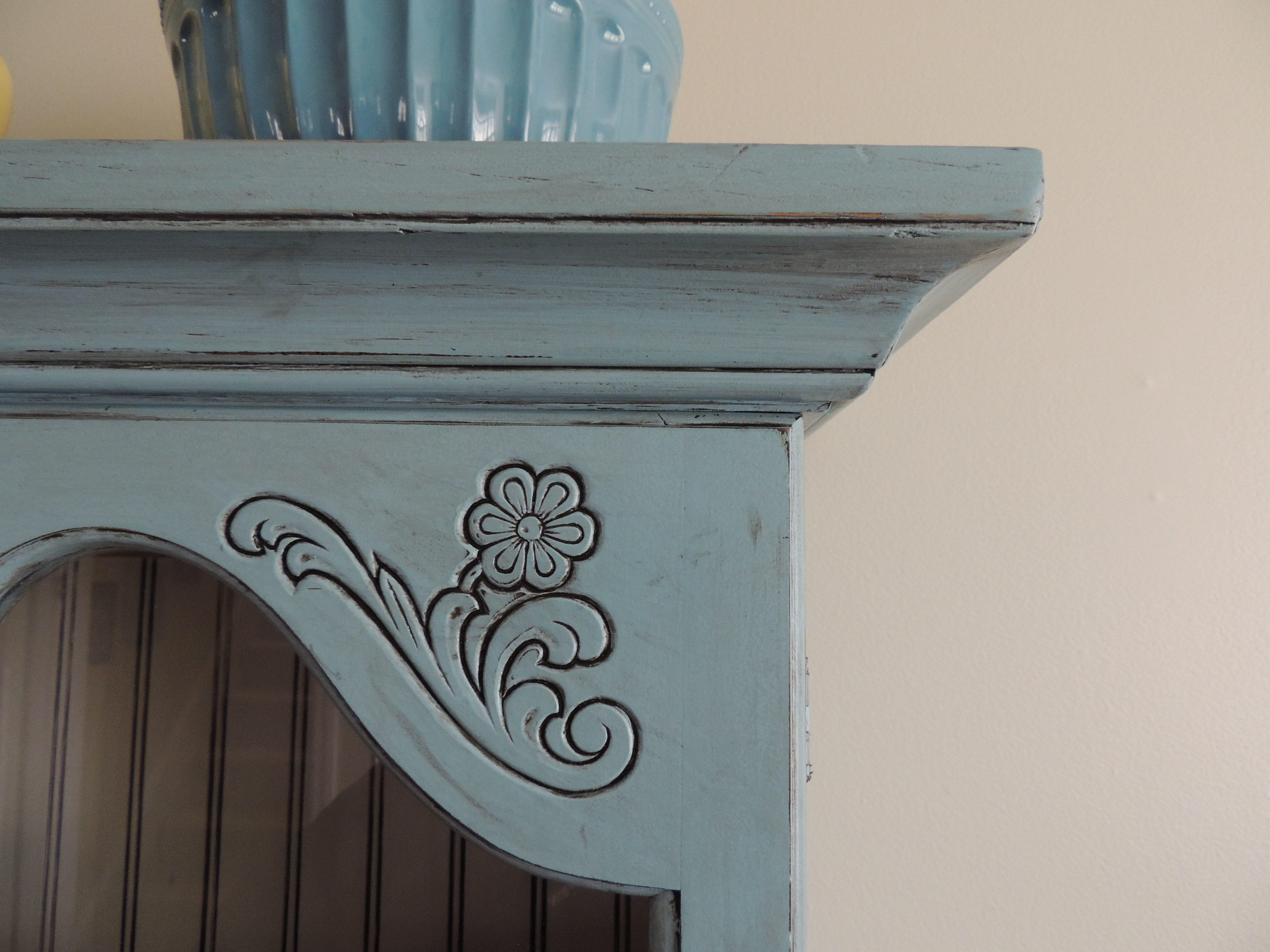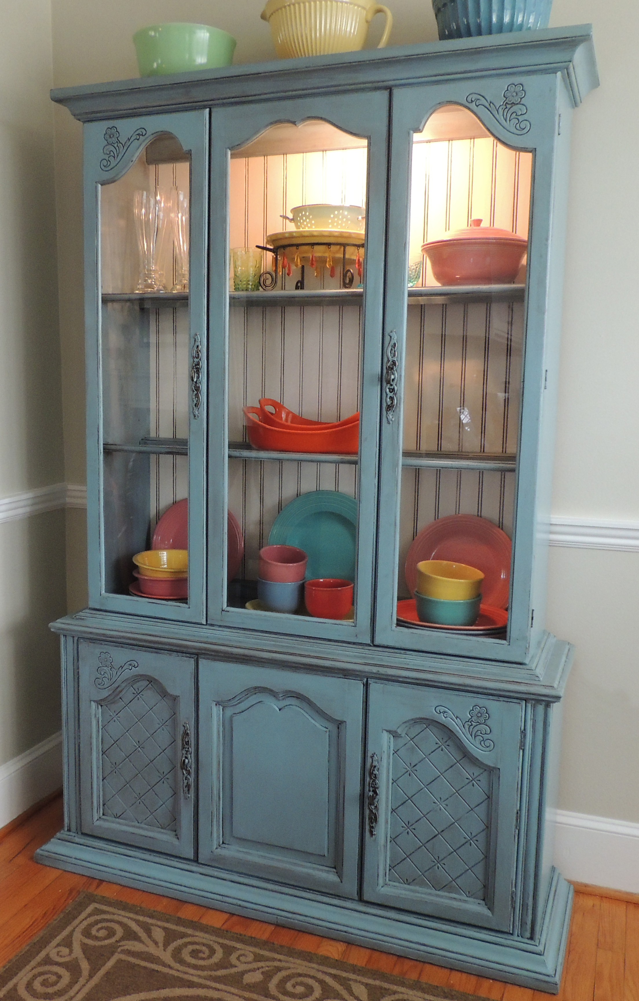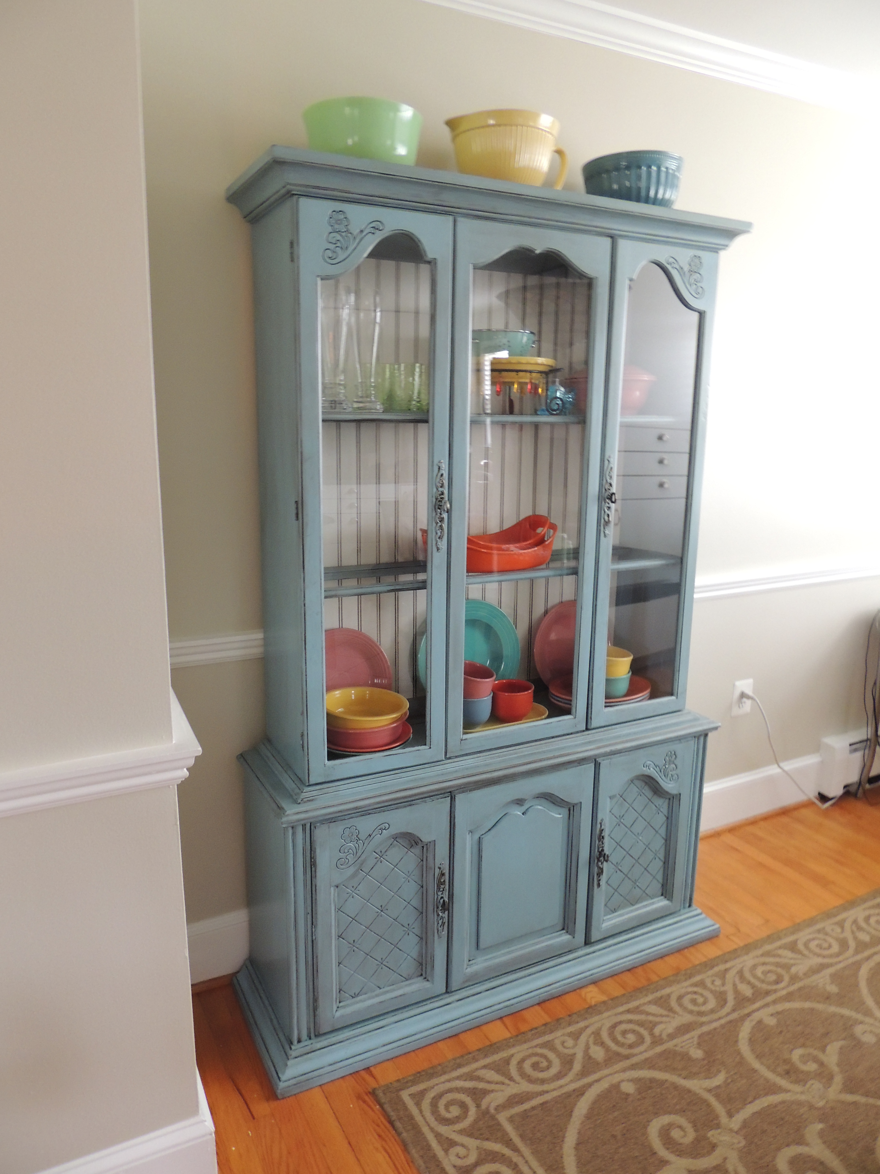 After – Sorry for the glare – I am not a photographer, that’s for sure! I took the back panel off of the cabinet and replaced it with wainscoting, then glazed the wainscoting. I am still waiting on a new glass shelf that I ordered for the middle (the one that was there was broken) Yes, those Rachel Ray dishes are just sitting on the ledges :)….& now I finally can display some of my Fiestaware!