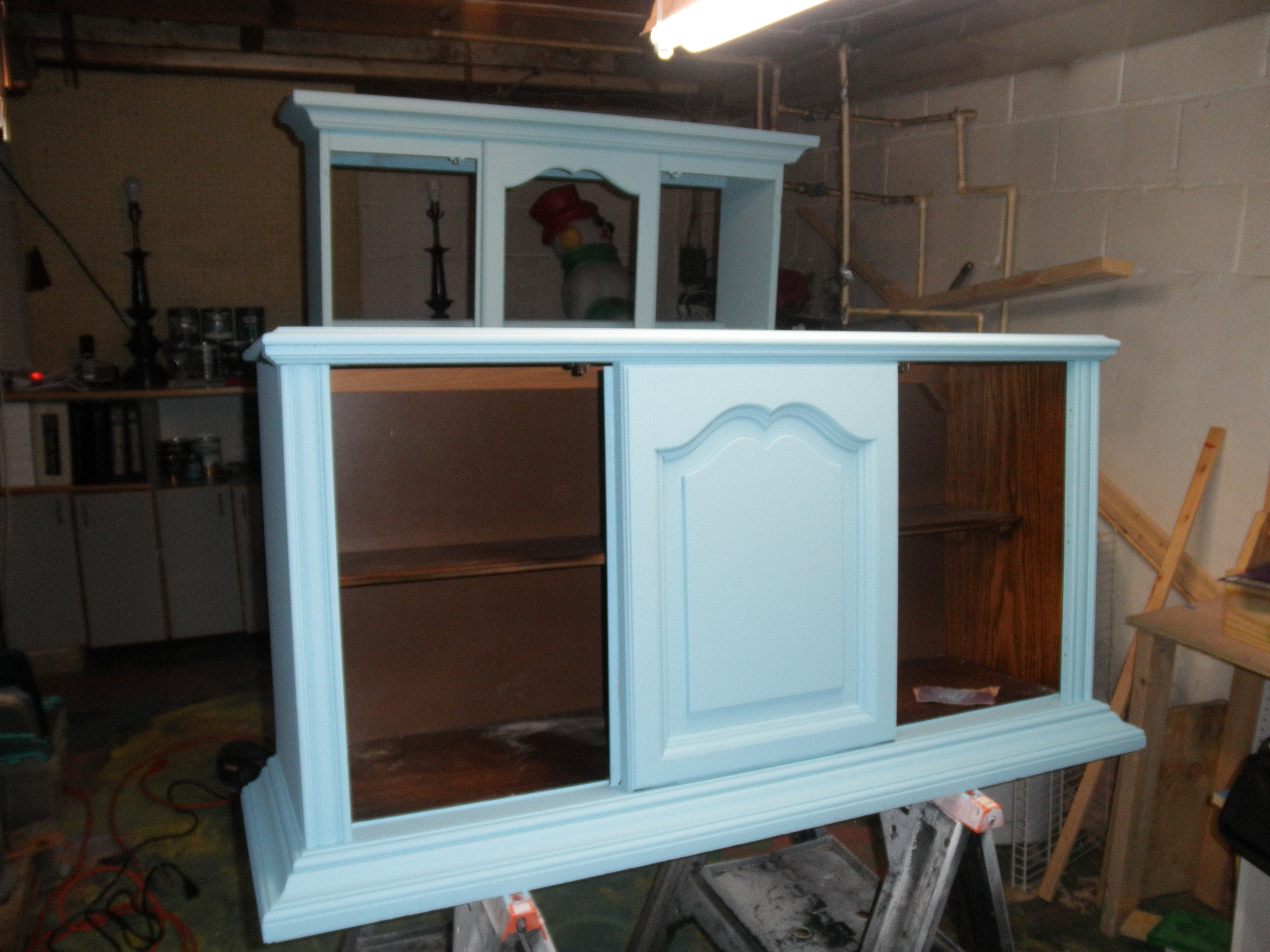 During – before sanding & glazing – the glaze completely changes the color….I know, it looks fluorescent blue here!